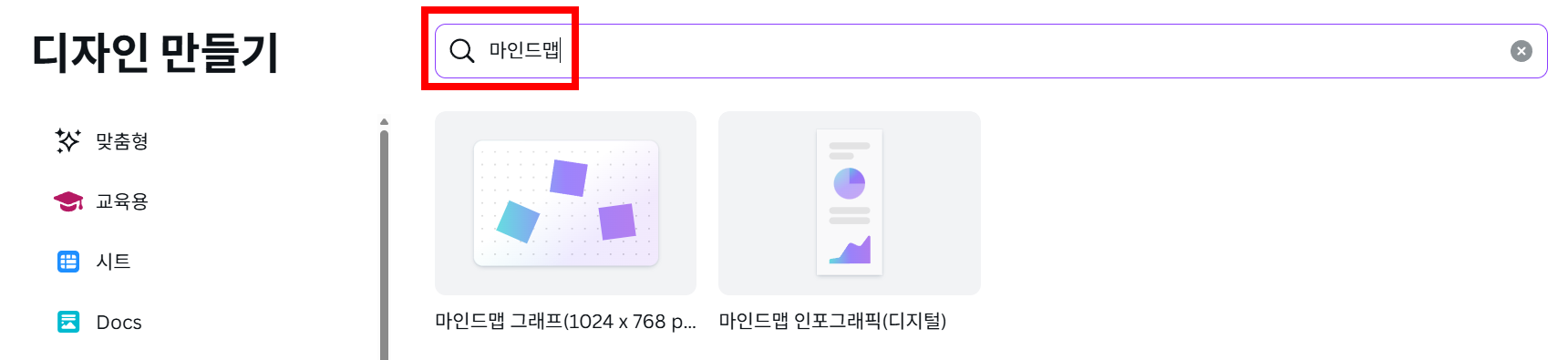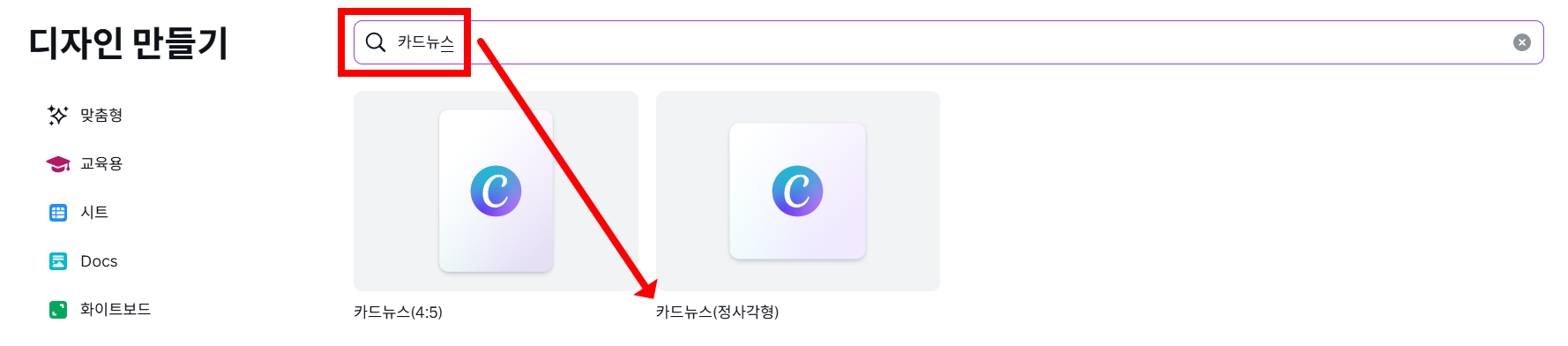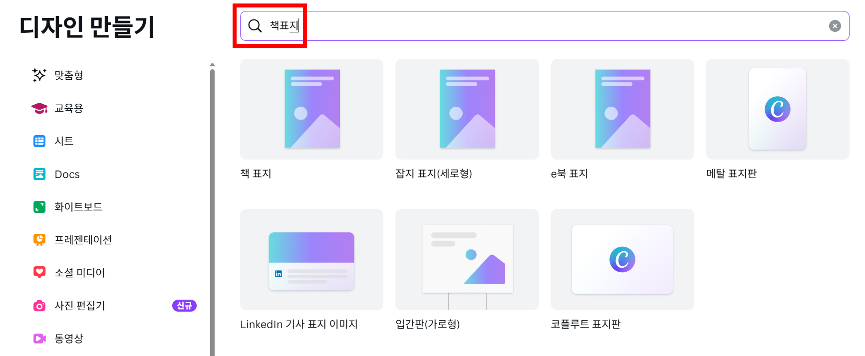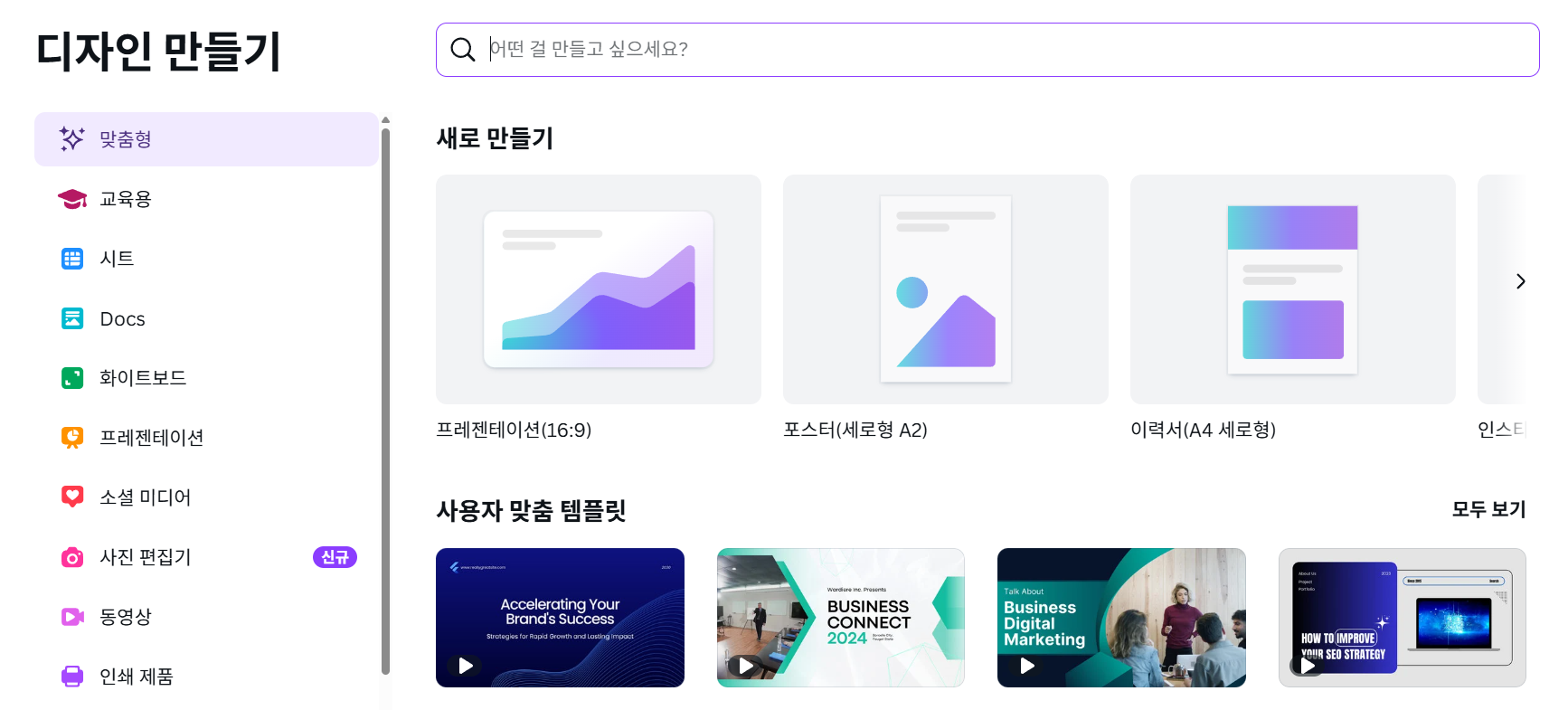 - 목적에 맞는 템플릿 검색 : Canva 메인 화면의 검색창에 만들고자 하는 디자인의 종류(예: '프레젠테이션', '인스타그램 게시물', '청첩장')를 입력합니다. 필요하다면 '교육', '비즈니스', '생일' 등 특정 테마를 추가하여 더욱 정확한 템플릿을 찾을 수 있습니다.