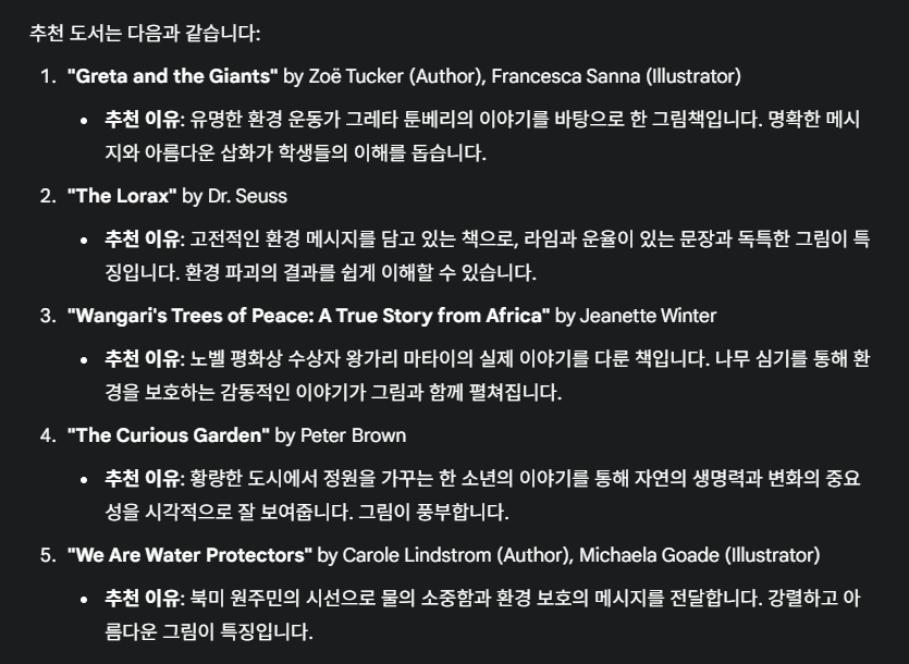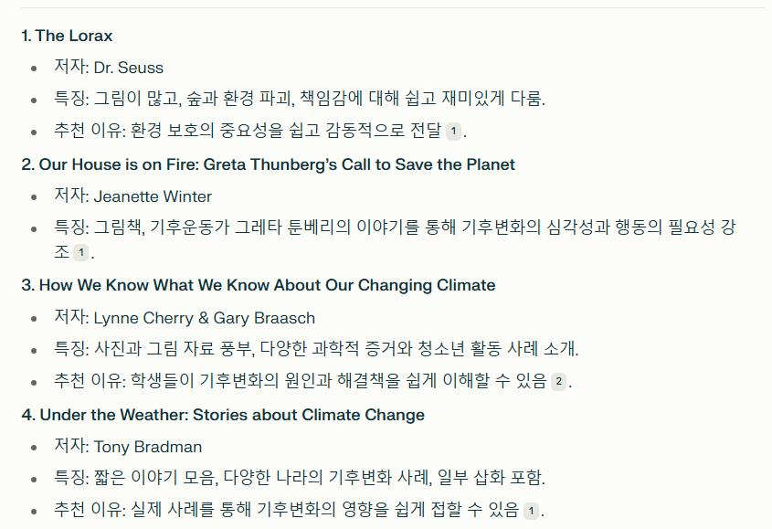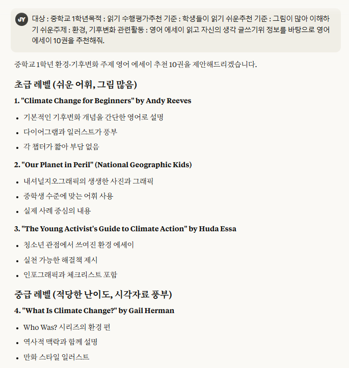 “대상: 중학교 1학년 / 목적: 읽기 수행평가 / 추천 기준: 쉬운 문장, 그림 많은 책 / 주제: 환경, 기후변화 / 활동: 생각 글쓰기”