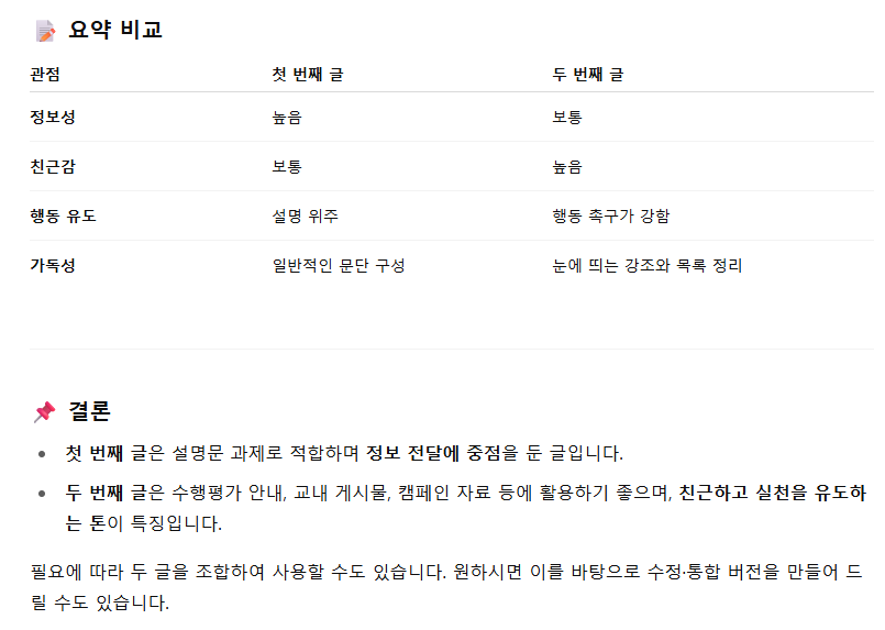 이번 비교를 통해 프롬프트 작성 방식에 따라 ChatGPT의 출력 결과가 달라질 수 있음을 확인할 수 있었습니다. 단순한 요청보다는 구체적이고 자세한 설명을 담은 프롬프트가 원하는 방향에 더 잘 맞는 결과를 생성해줍니다. 또한 개조식과 문장식 모두 효과적일 수 있지만, 상황에 따라 더 명확하고 일관된 결과를 원한다면 문장식 설명이 더 적합함을 알 수 있었습니다. 앞으로 AI를 활용한 글쓰기나 과제, 자료 제작에서 프롬프트 설계의 중요성을 인식하고, 목적에 맞는 표현 방식을 선택하는 것이 필요합니다.