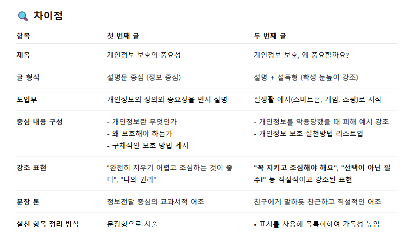 요즘 ChatGPT와 같은 생성형 AI 도구를 다양한 교육 및 업무 현장에서 활용하는 사례가 늘고 있습니다. 특히 글쓰기나 콘텐츠 제작에서 원하는 결과물을 얻기 위해서는 프롬프트(prompt)를 어떻게 작성하느냐가 매우 중요합니다. 본 분석에서는 동일한 주제인 ‘개인정보 보호의 중요성’을 바탕으로, 프롬프트 작성 방식에 따라 어떤 차이가 있는지를 비교하였습니다. 단순한 요청, 문장형 프롬프트, 개조식 프롬프트의 결과를 비교함으로써, 어떤 방식이 더 효과적인 결과를 제공하는지에 대해 살펴보았습니다.