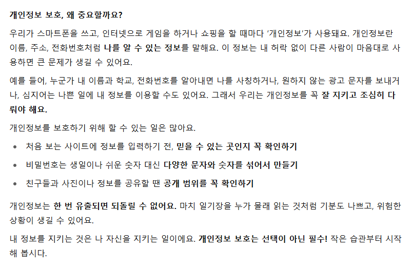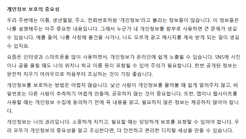 | 개인정보 보호의 중요성을 설명하는 글을 작성해줘. | 개인정보 보호의 중요성을 중학생을 대상으로 설명하는 글을 1000자 이내로 출력해줘. 용어, 설명 등 쉽고 친절하게 톤앤매너로 출력해줘. | 주제 : 개인정보 보호의 중요성 대상 : 중학생 글의 종류 : 설명문 글자수 : 1000자 이내 톤앤매너 : 용어, 설명 등 쉽고 친절하게 |