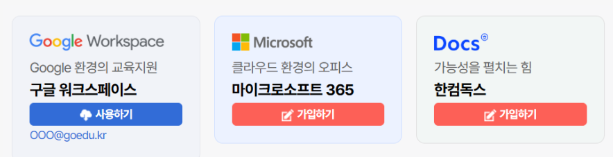 하나의 계정으로 구글 워크스페이스, 마이크로소프트 365, 한컴 독스, 하이러닝, NEIS+ 등을 이용할 수 있습니다.