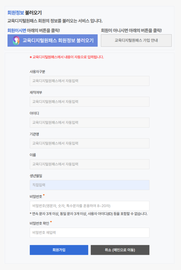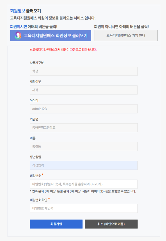 3. 아래의 그림에서 교육디지털원패스 회원정보 불러오기 버튼을 클릭합니다.